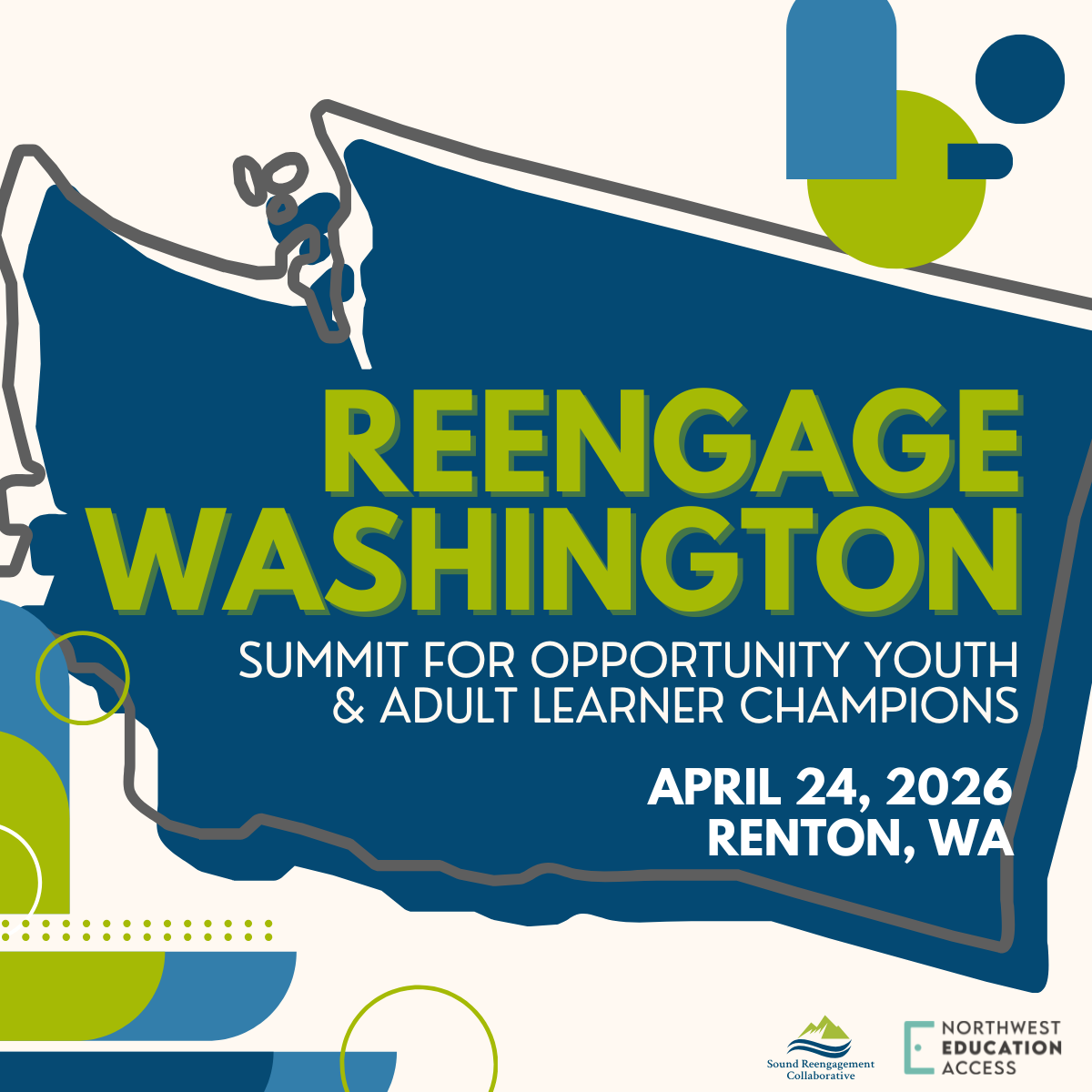 ANNOUNCEMENT: Reengage Washington Summit for Opportunity Youth and Adult Learner Champions is happening April 24th! Registration is open and we hope to see you there!